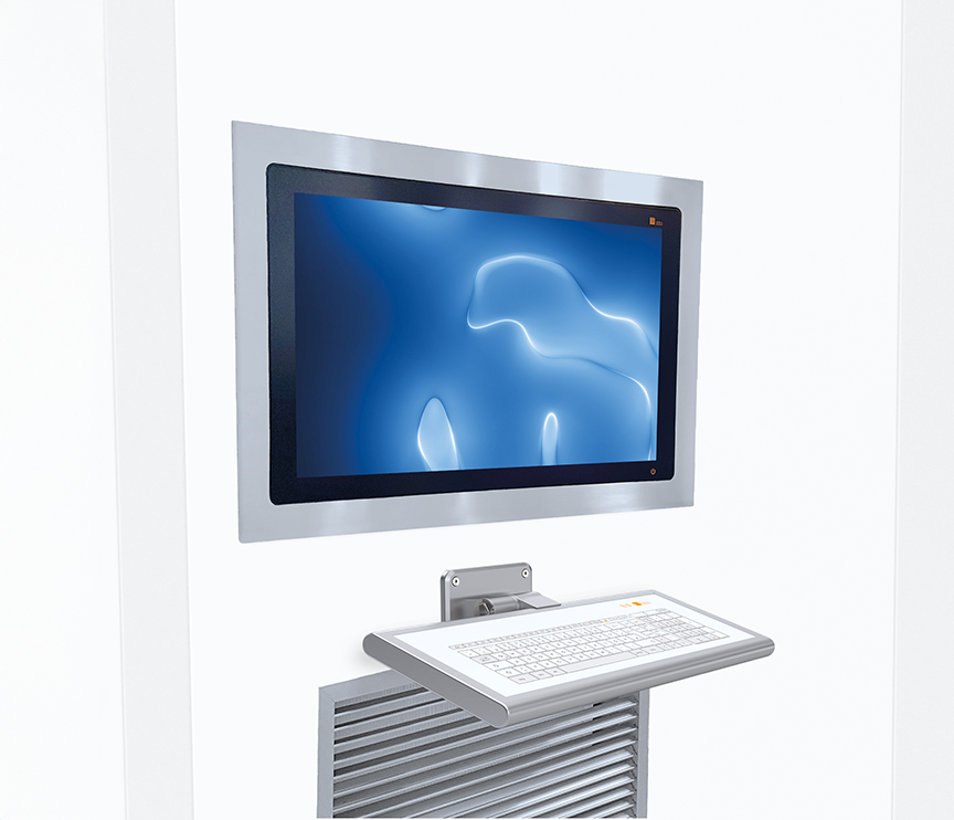 It is ideally suitable for the display of MES software, ERP and process control systems. An optional IP65 stainless steel protective tray, which is installed between the display and the wall, can be added. This retains the cleanroom status once the panel has been removed.